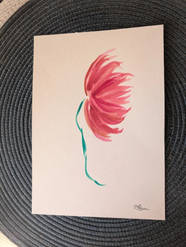 Delicato acquerello raffigurante un fiore stilizzato dai toni rossi e rosa, con un gambo verde.
