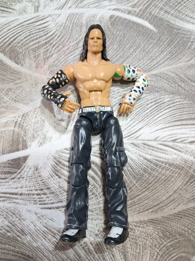 Action figure di un wrestler. - Dettagli del corpo muscoloso. - Pantaloni neri con cintura bianca. - Braccia con decorazioni colorate e a pois.