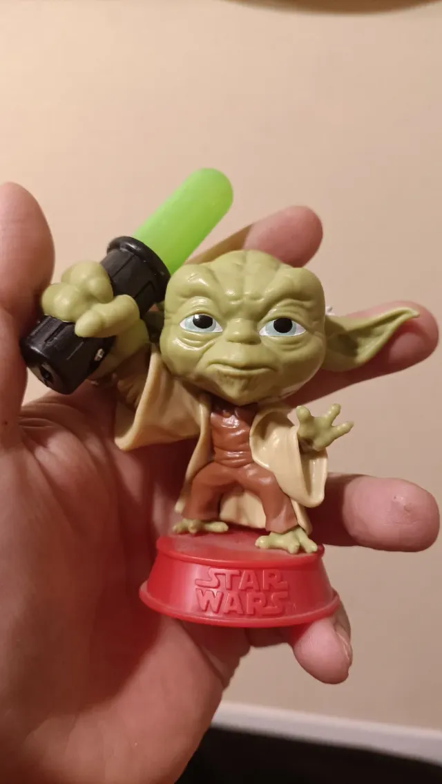 Action figure di Yoda, personaggio iconico di Star Wars, con la sua spada laser verde. - Base rossa con logo STAR WARS inciso.