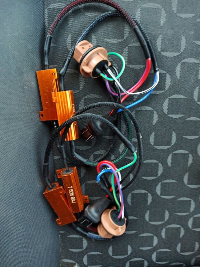 Set di adattatori con resistori di carico per lampade a LED. - Resistori in alluminio arancione. - Potenza 50W. - Connettori per lampade. - Cablaggio incluso.