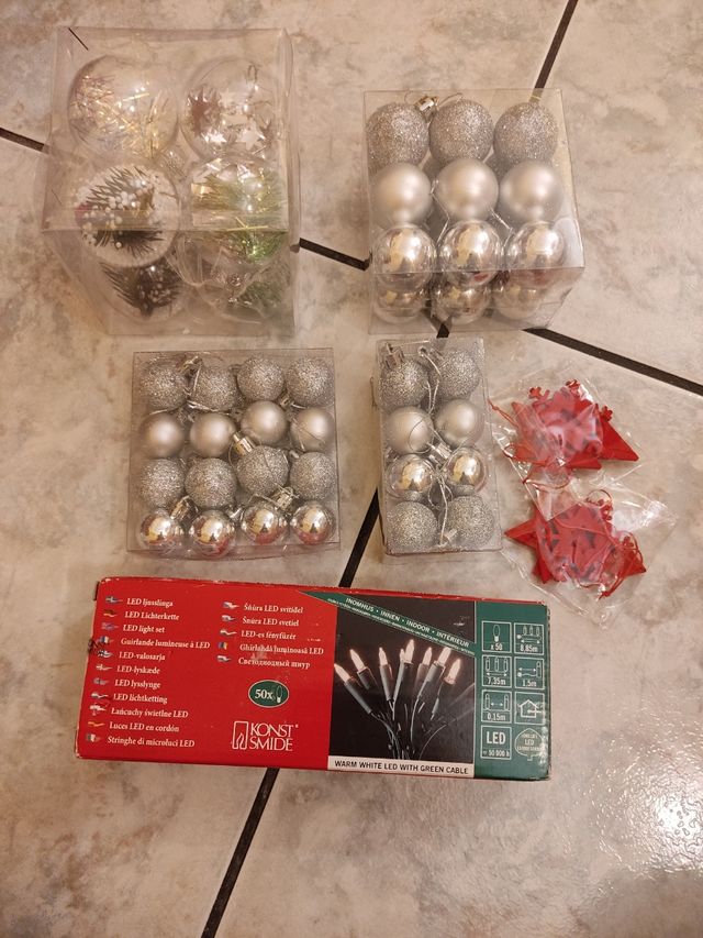 Dettagli del prodotto4 palline grandi decorate all'interno, 18 palline più piccole di cui 9 glitterate e 9 lisce,16 palline ancora più piccole metà glitterate e metà lisce, 16 palline piccolissime sempre metà glitterate e metà lisce + 50 luci per Natale fatta da miniluci bianchi caldi/230V interno/ cavo verde