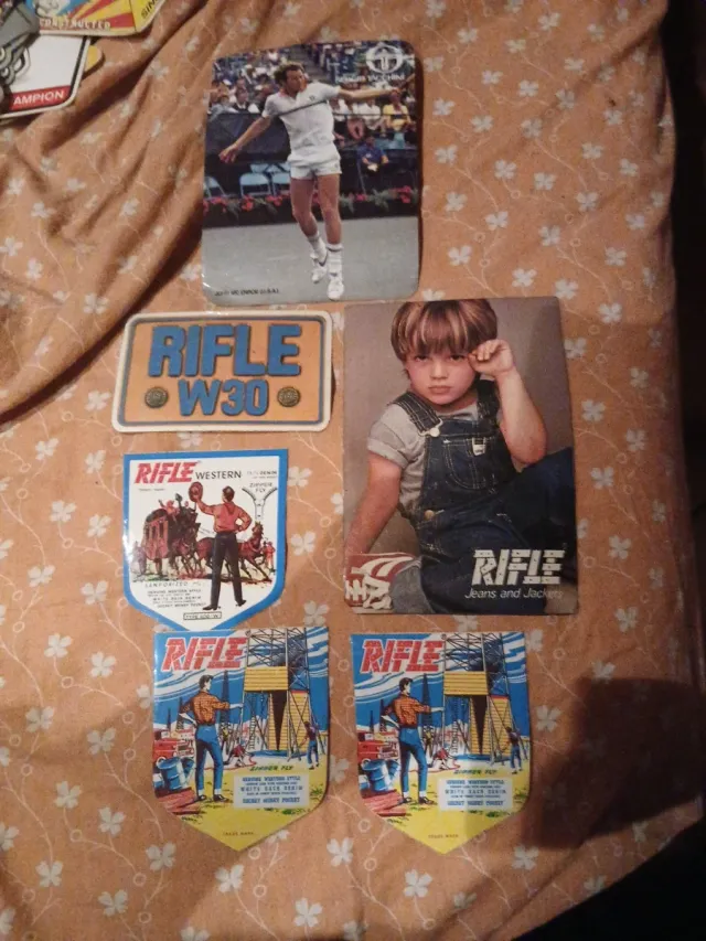 Set di adesivi vintage del marchio Rifle. - Adesivo Rifle W30. - Adesivo Rifle Western con scena western. - Due adesivi Rifle con scena di costruzione. Regalo adesivo Sergio Tacchini