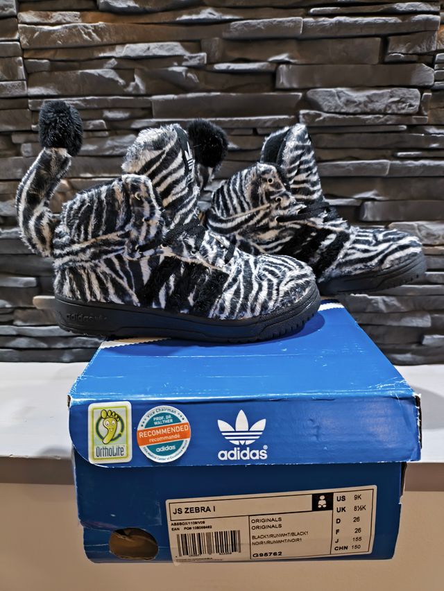 Dettagli del prodottoScarpe Adidas Originals Jeremy Scott 🦓 zebra. una collaborazione unica con Jeremy Scott. Design ispirato alle zebre, con dettagli in pelliccia sintetica e simpatiche codine.
