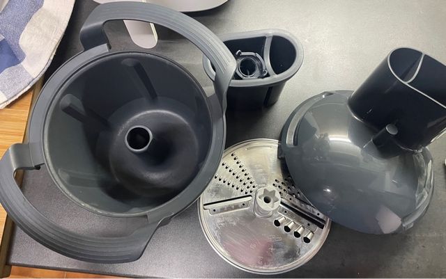 Accessorio affettatutto per Bimby TM6. Ideale per preparare verdure e altri ingredienti. - Lama in acciaio inossidabile. - Ciotola in plastica resistente.