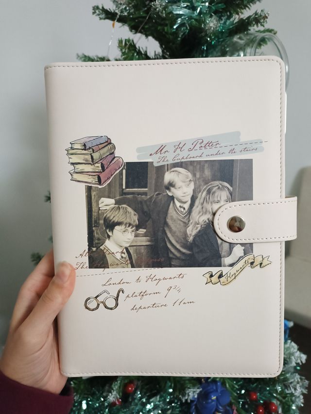 Dettagli del prodottoAgenda con copertina rigida a tema Harry Potter, con chiusura a bottone. Presenta una stampa di Harry, Ron e Hermione, con dettagli grafici ispirati al mondo magico.