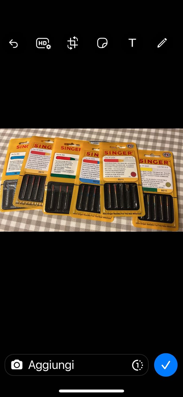 Dettagli del prodottoAghi per macchina da cucire da utilizzare per vari tipi di tessuto. Il prezzo è riferito a tutto il lotto. Le singole confezioni sono nuove, sigillate tranne una che regalerò a chi acquista tutto il lotto