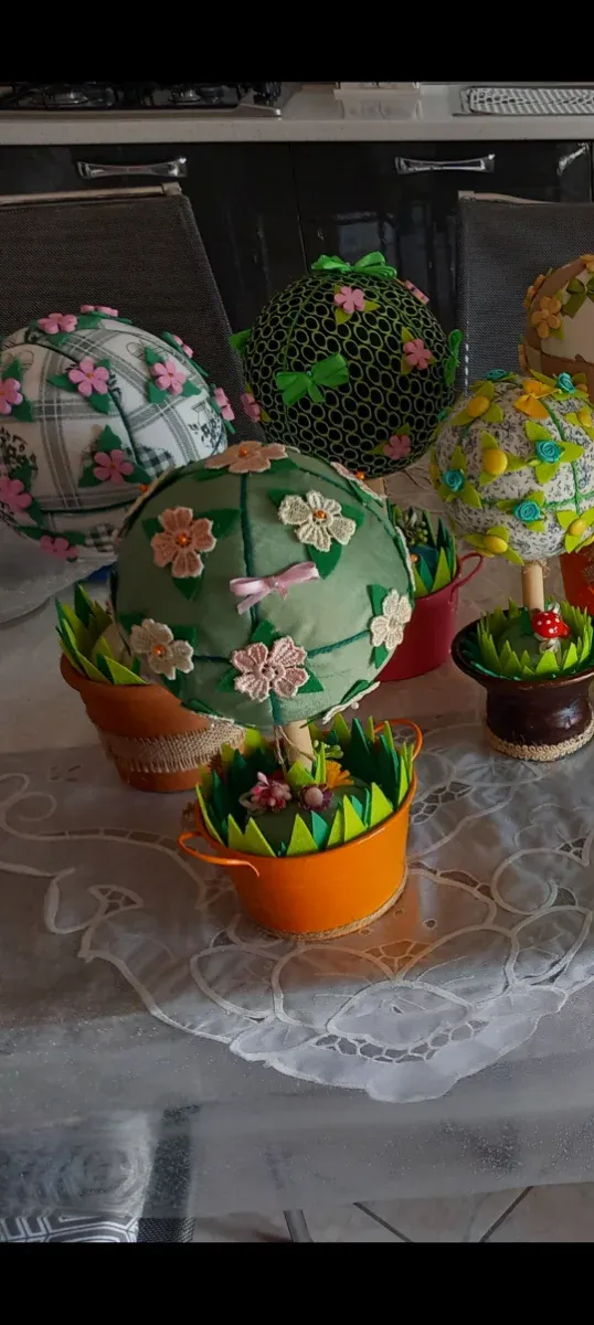 Dettagli del prodottoDeliziosi alberelli decorativi realizzati a mano con stoffa, perfetti per aggiungere un tocco di originalità alla tua casa.