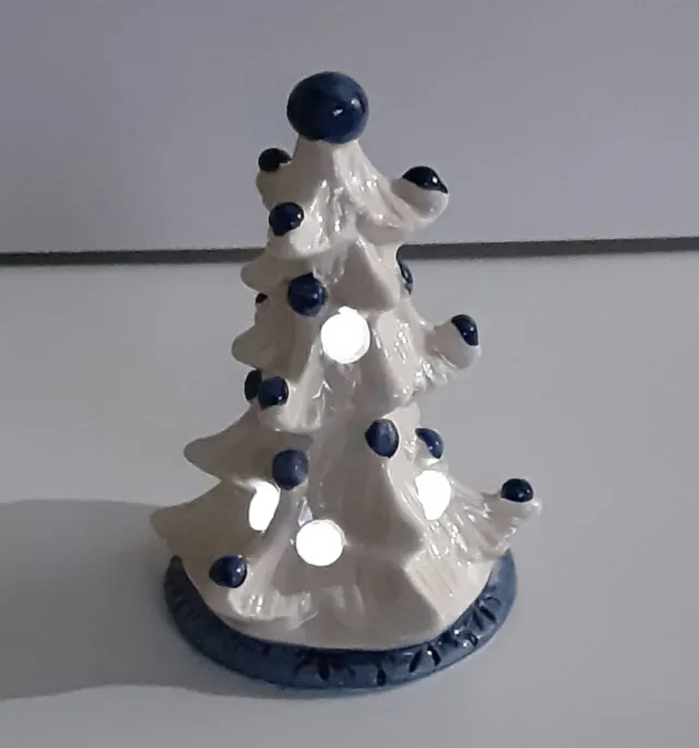 Deliziosi alberelli di Natale in ceramica, perfetti per creare un'atmosfera festiva. - Decorati con sfere blu. - Base blu. - Illuminazione interna.