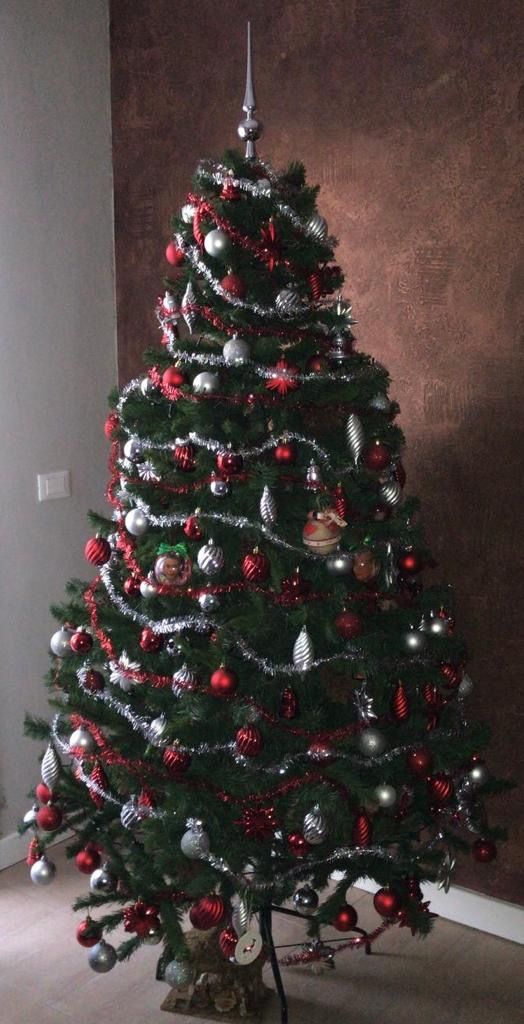 Albero di Natale alto 1 m e 90cm, con palline di Natale argento e rosse e stella di Natale
