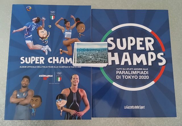 Dettagli del prodottoVendo due album delle Olimpiadi e Paralimpiadi di Tokyo 2020.  Super Champs è l'album ufficiale dell'Italia Team alle Olimpiadi, mentre Super Hamps presenta tutti gli atleti azzurri alle Paralimpiadi. Entrambi gli album sono in ottime condizioni.