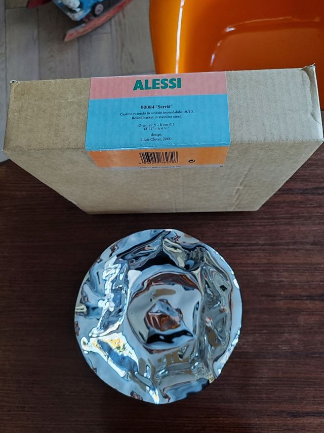 Centrotavola Alessi in acciaio inossidabile, diametro 27,5 cm, altezza 6,5 cm. Design Lluis Clotet, anno 2000. Nuovo con scatola originale.