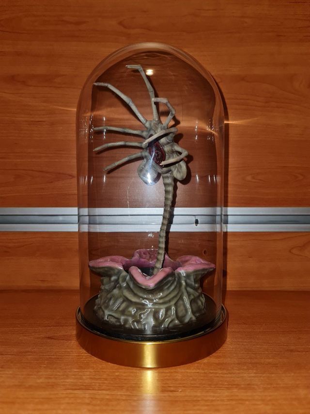 Dettagli del prodottoFigurina dettagliata di un Facehugger dall'universo di Alien, presentata all'interno di una cupola di vetro.
