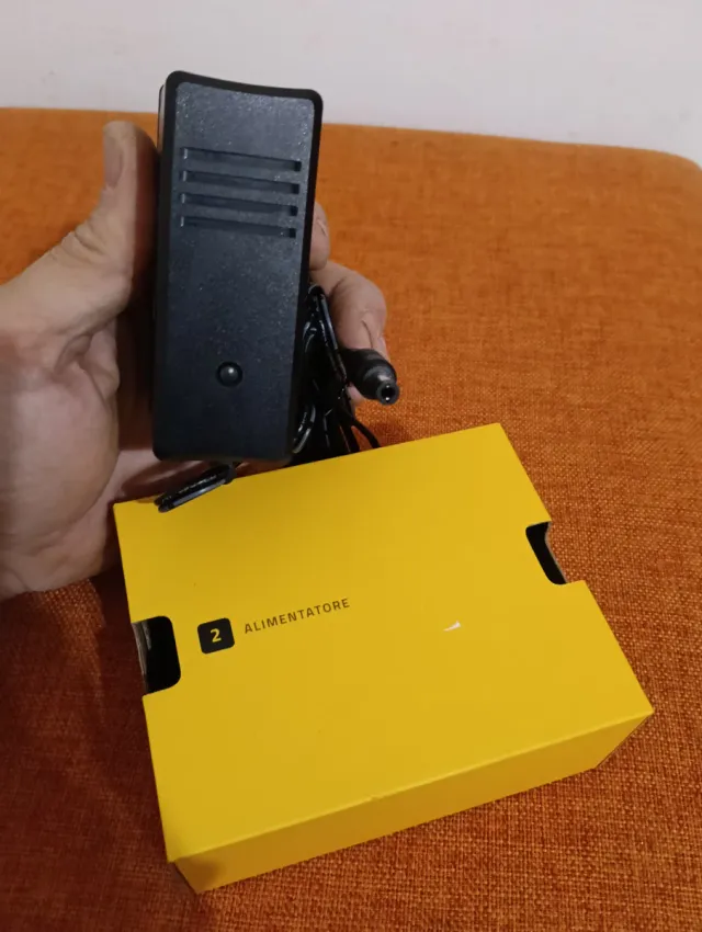 Alimentatore da muro con spina. - Tensione di uscita: 12V DC. - Design compatto.
