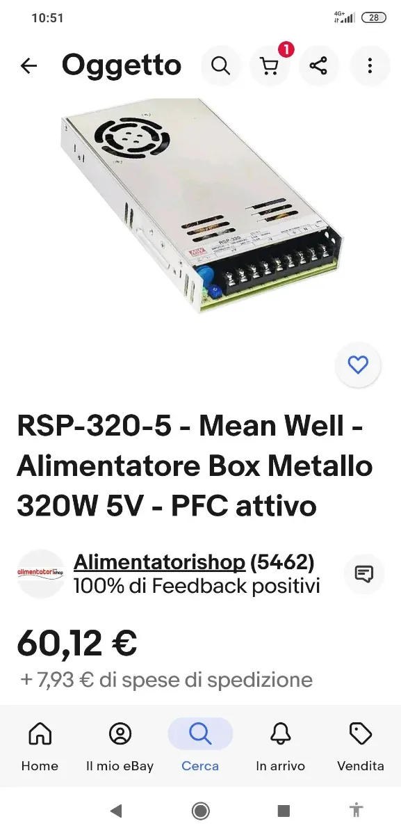 Alimentatore Mean Well modello RSP-320-5. - Potenza 320W. - Tensione di uscita 5V. - PFC attivo. - Box in metallo.