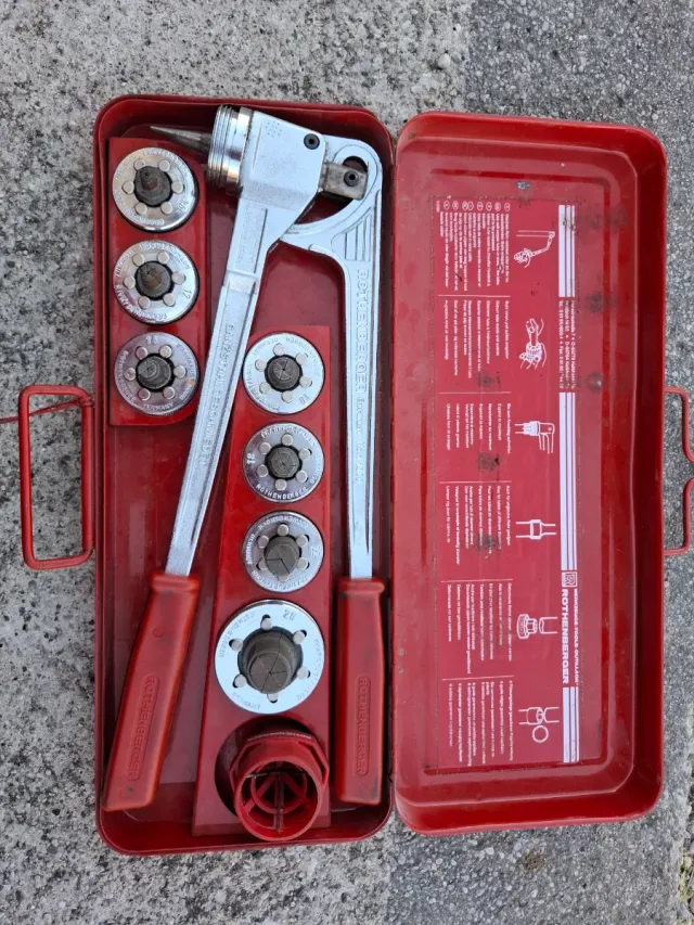 Set di utensili per allargare tubi ROTHENBERGER. Usato poco. - Include pinza allargatubi. - Set di matrici di diverse misure. ( 10-12-14-16-18-22-28).