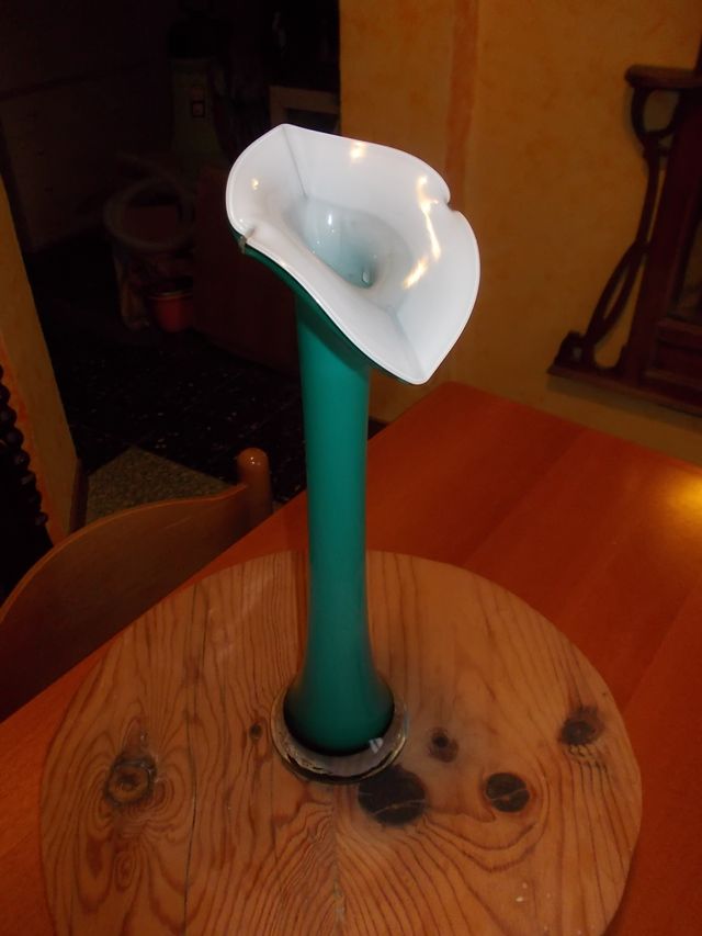 Nice flower vase in colored glass, in the shape of a calla lily.