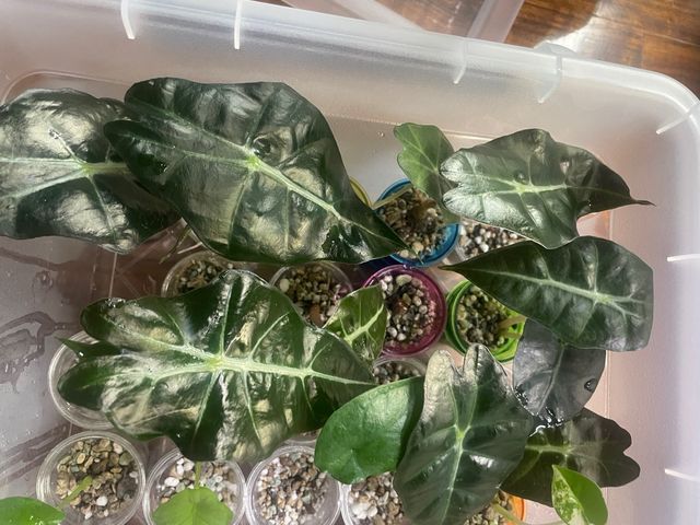 Dettagli del prodottoBellissima Alocasia Polly in vaso autoirrigante. Le foglie sono di un verde intenso e lucido.