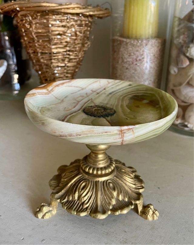 un'alzatina centrotavola decorativa in onice verde con base e piedistallo in ottone ( oppure bronzo dorato, non so !).