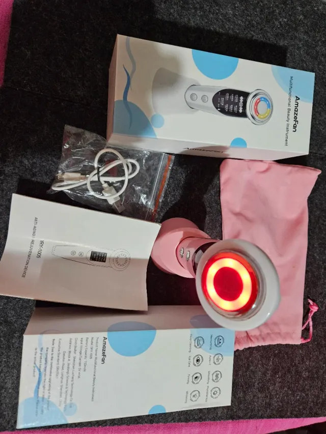 Dettagli del prodottoStrumento di bellezza multifunzionale AmazeFan. Modello: XRY-1005. Include cavo di ricarica USB. Viene con una borsa di stoccaggio rosa. Nelle foto sono visibili tutti i dettagli. Funziona perfettamente. La descrizione è stata tradotta automaticamente.