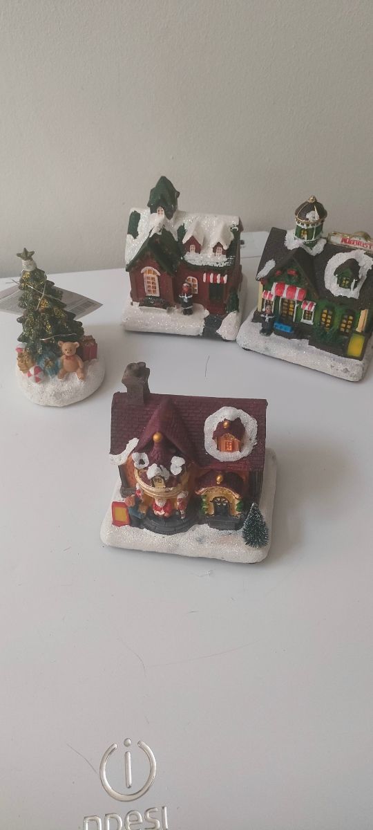 Set ambientazione villaggio, composto da 3 case illuminanti(batteria) 14x11 e albero con illuminazione 15 cm( batteria). In blocco No lemax Trieste