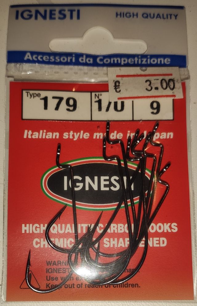Ami da pesca Ignesti, modello 179, misura 1/0. - Tipo: Texas Rig - Materiale: Carbonio - Made in Japan - Prezzo: € 2.00 Qantità totale di pacchetti: 10