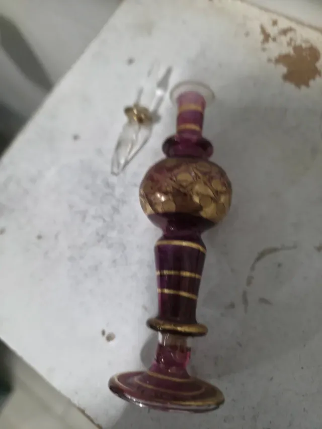 Ampolla in vetro di manifattura etnica, proveniente dalla Tunisia. Presenta decorazioni dorate. - Materiale: Vetro - Origine: Tunisia - Decorazioni: Dorate
