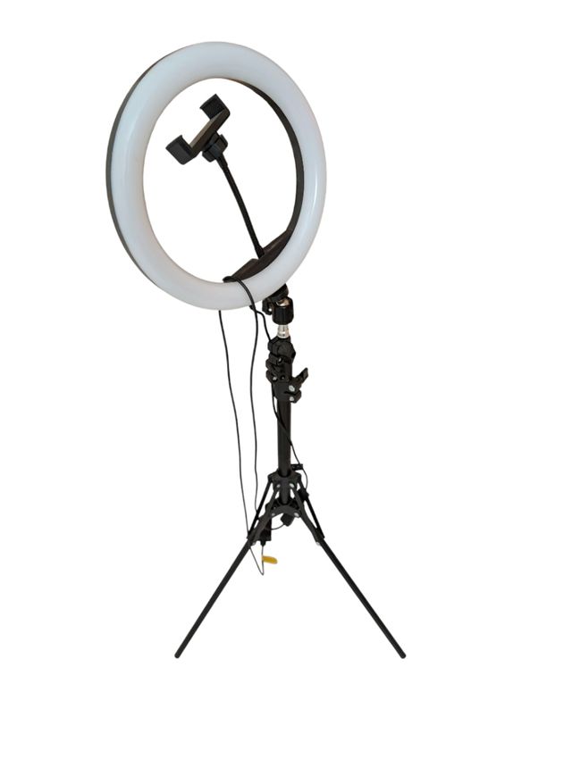 Anello luminoso con treppiede e telecomando per selfie. - Treppiede regolabile. - Telecomando incluso.