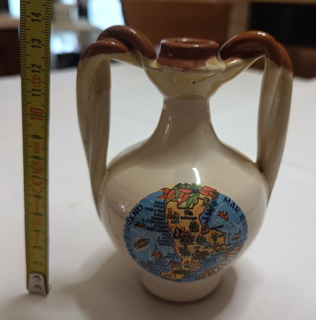 Dettagli del prodottoAnfora di piccole dimensioni, in terracotta, souvenir della Calabria, un tempo, quando ancora non esisteva il frigorifero, le anfore di dimensioni più grandi, venivano usate per contenere l'acqua e mantenerla fresca.