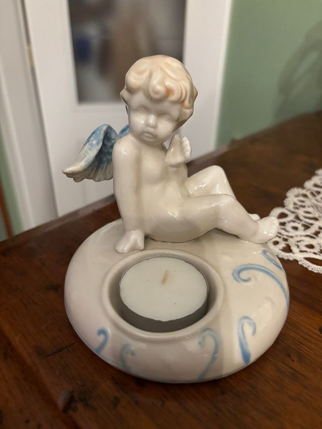Grazioso angelo in ceramica con candela inclusa. Presenta un piccolo difetto sul fondo. - Decorazione con dettagli azzurri.