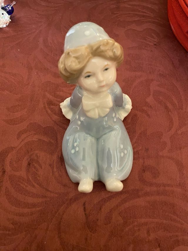 Deliziosa statuetta in ceramica raffigurante una bambina con cappellino e tutina. - Dettagli dipinti a mano. - Finitura lucida. - Base rotonda.