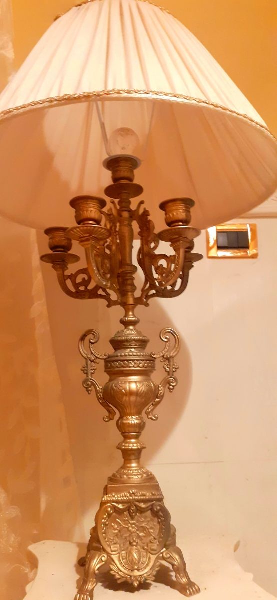 Dettagli del prodottoAntica lampada su candelabro in ottone con paralume