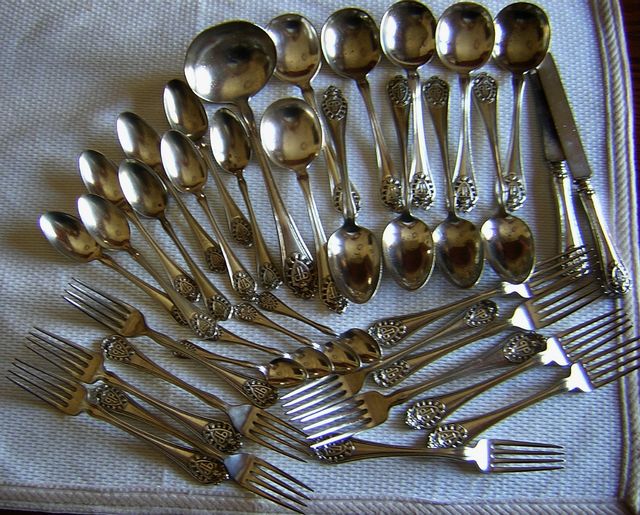 Dettagli del prodottoAntica posateria in argentone, non del tutto completa. aggiungo anche posate in argento 800/925. descrizione: 29 pz in argento 800/925 solo la parte del manico, 36 PZ in argentone .