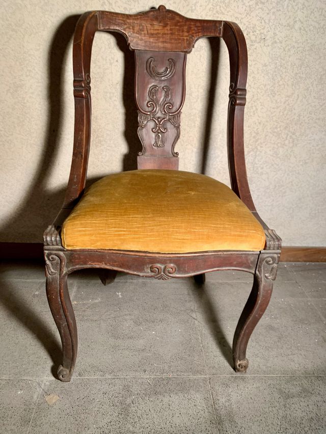 Sedia a gondola in legno con schienale e gambe intagliate, tamburello appena foderato con velluto di Rubelli color ocra.