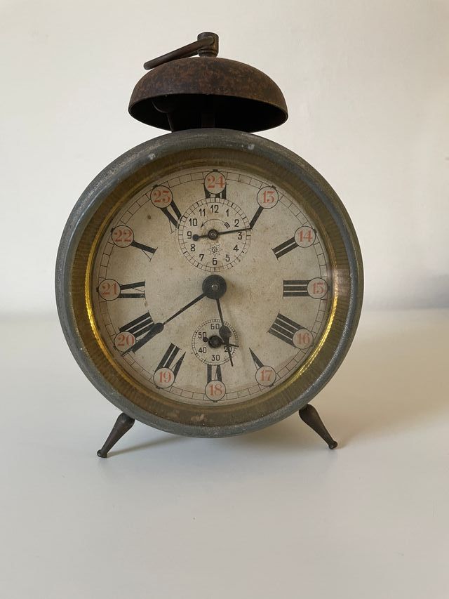 La sveglia viene venduta nelle sue condizioni originali da ritrovamento, volutamente non lucidata per preservare la sua splendida e autentica patina del tempo. Il meccanismo non è funzionante e necessita di revisione.