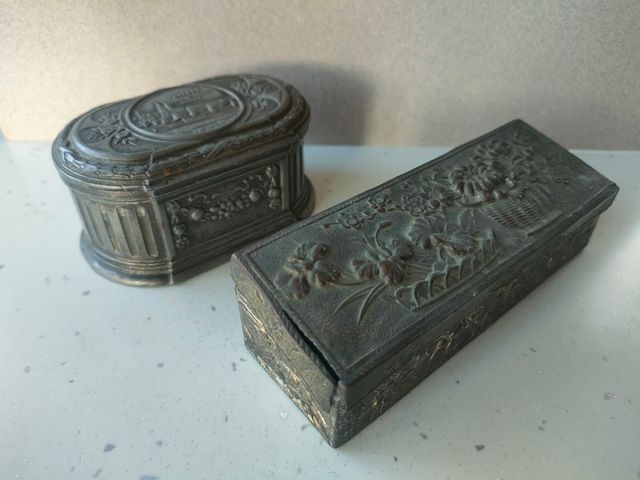 Dettagli del prodottoAntichi contenitori in metallo con motivi floreali in rilievo