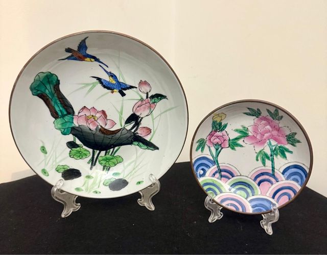 Coppia di antichi piatti cinesi in porcellana con retro in metallo