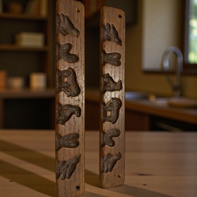 Dettagli del prodottoPareja de moldes de madera holandeses para galletas speculaas, finales del siglo XIX – principios del XX. Tallados a mano en madera de peral o nogal, muestran figuras de aves, perros, un animal pastoril y flores. Proceden de la zona de Utrecht/Frisia. Cada pieza mide aprox. 30 × 5 × 1,5 cm. En buen estado, con pátina original y marcas de uso acordes a la edad. Fragmentos de una antigua tradición doméstica, donde el aroma a canela aún parece flotar en el aire.