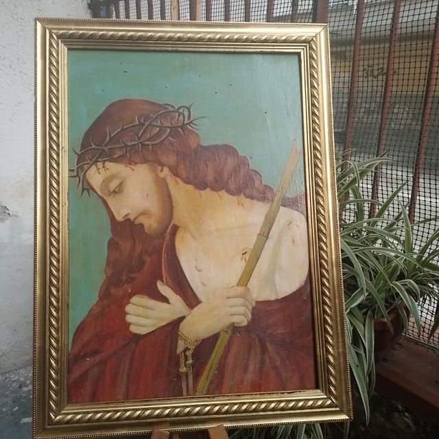 Dettagli del prodottoAntico dipinto a olio barocco,Ecce homo, dipinto a mano su pala in legno, firmato, con cornice oro intarsiata a colonna, mis tot.47x64 cm;