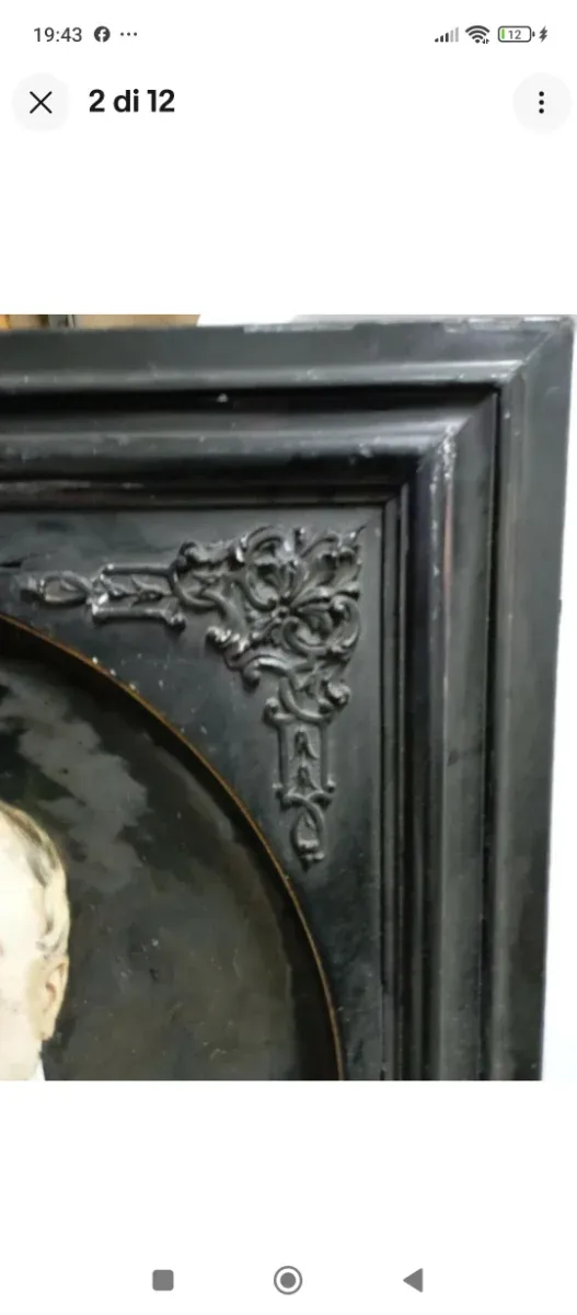 Dettagli del prodottoBellissima cornice antica in legno nero, con dettagli decorativi intagliati.