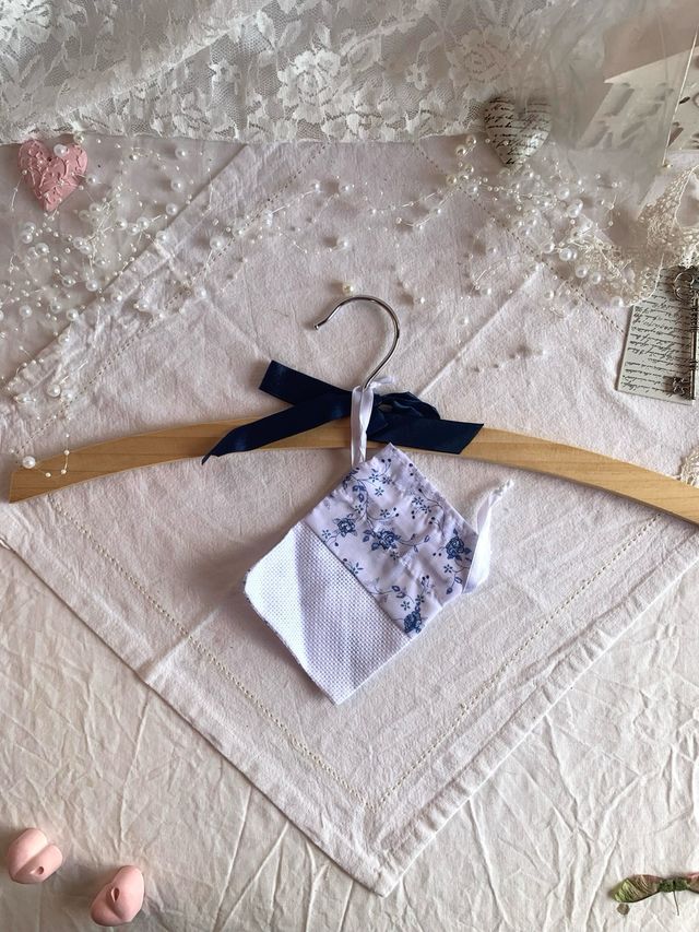 Dettagli del prodottoAppendi abiti in legno con sacchettino per profumare la biancheria da ricamare, con inserto di tela Aida.