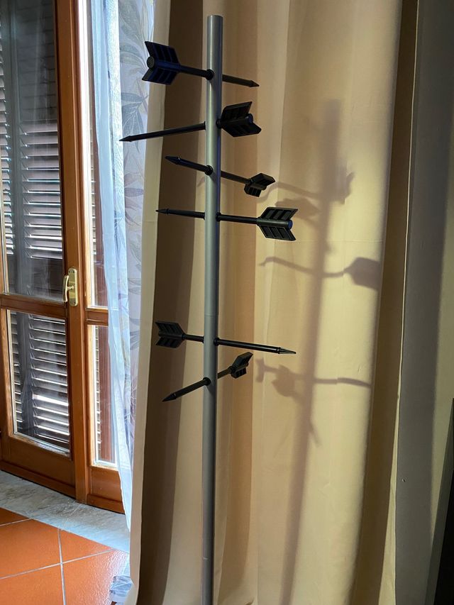 Dettagli del prodottoAppendiabiti grigio in metallo con frecce in plastica. Unico difetto visibile nell’ultima foto. Altezza 165 cm