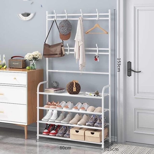Comodo, pratico ed elegante appendiabiti con scarpiera a 4 ripiani, come da foto, colore nero.