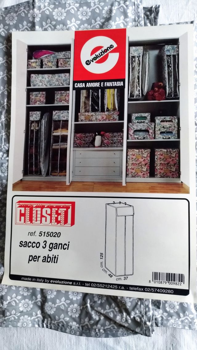 Dettagli del prodottoappendiabiti da appendere a un bastone o a uno stand appendiabiti o all'interno del guardaroba. Appeso ad un bastone si può usare come guardaroba perché è completamento chiuso da una zip e presenta una finestrella trasparente dove si può vedere il contenuto. Non ha ripiani, utilizzabile solo per abiti da appendere. Misure in cm: 37x48x 125h. Materiale: plastica facilmente lavabile. Nuovo mai usato, aperto solo per verificare l'integrità dell'articolo.