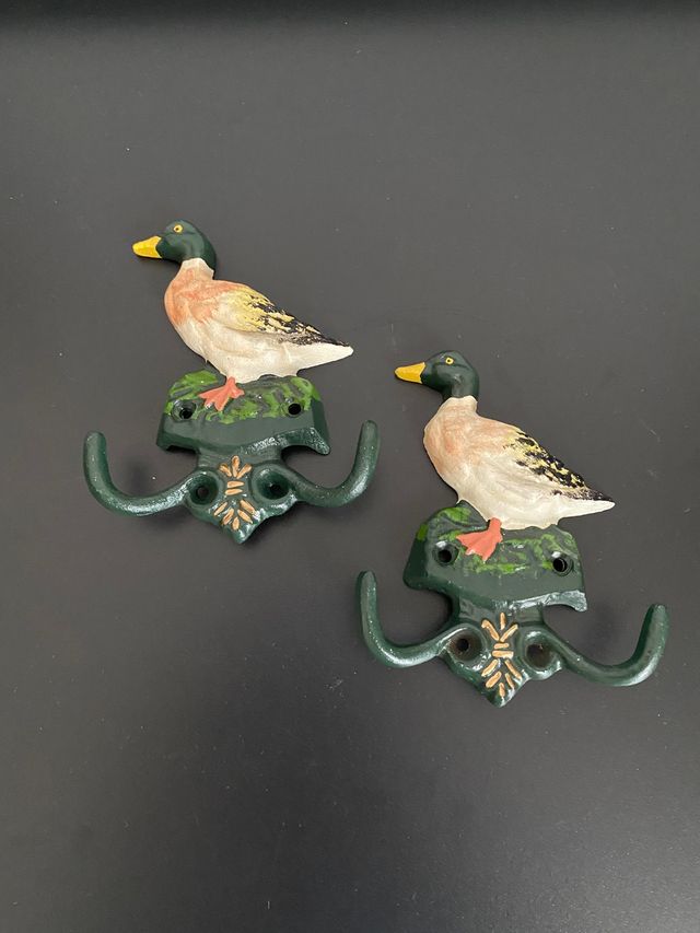 Due appendini anatre in ghisa colorati. Dimensioni 12x10 cm circa.