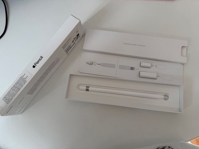 Dettagli del prodottoApple Pencil di prima generazione, progettato per iPad. Include Apple Pencil, adattatore Lightning, punta aggiuntiva e cavo di ricarica. La descrizione è stata tradotta automaticamente.