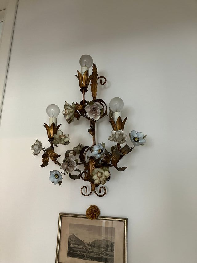Applique di ottone dorato e fiorellini in porcellana. 3L. Va abbinato al lampadario di ottone.