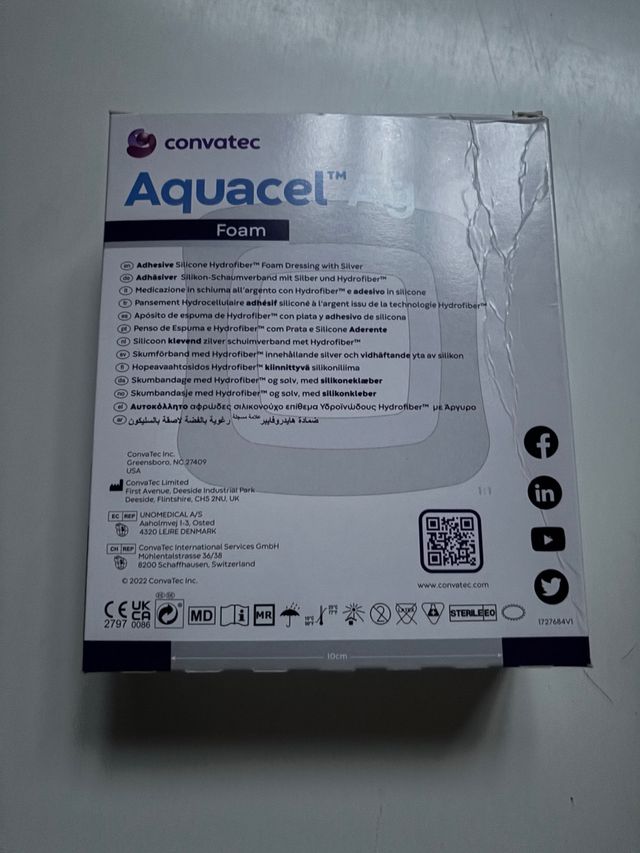 Confezione da 10 medicazioni Aquacel Foam adesive con argento. - Medicazione in schiuma di silicone idrofibra. - Adesivo in silicone. - Confezione sterile.