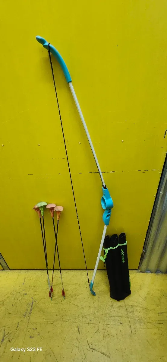 Dettagli del prodottoSet di arco e frecce per iniziare con il tiro con l'arco. - Arco di plastica blu e bianco. - 4 frecce con ventosa. - Guanto di protezione nero. La descrizione è stata tradotta automaticamente.