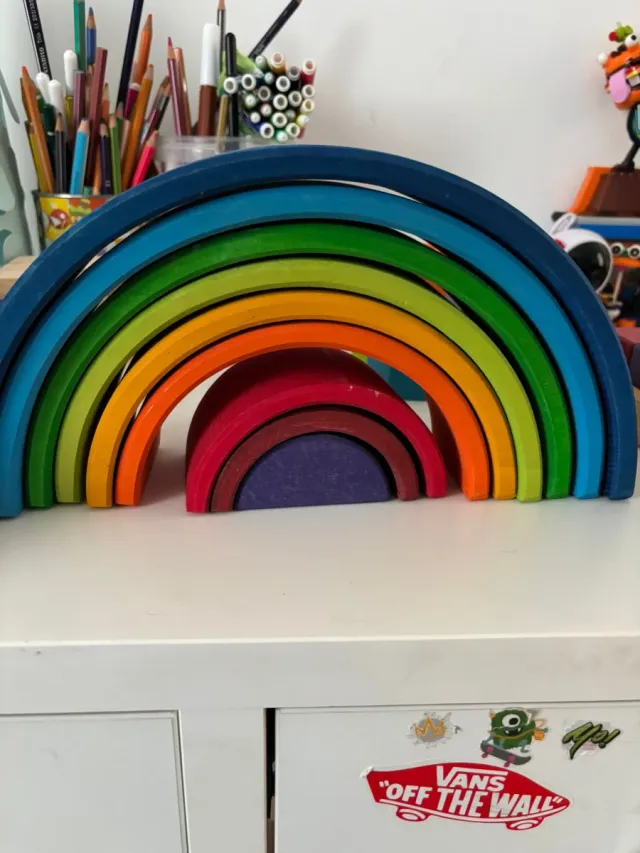Dettagli del prodottoIconico arcobaleno Grimm's in legno, un classico gioco Stainer