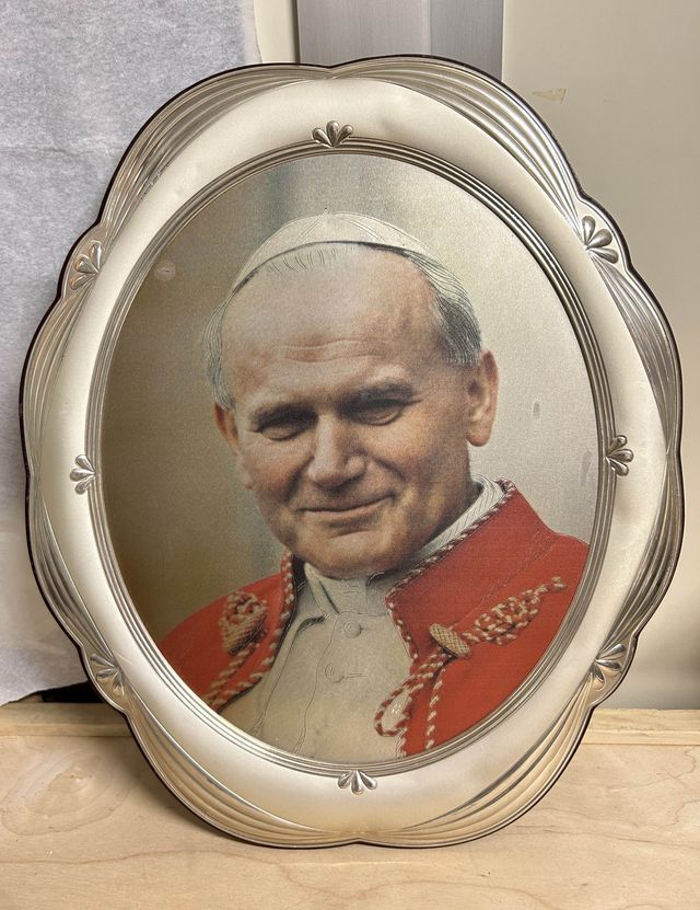 QUADRO BELLISSIMO WOJTYLA PLACCATO ARGENTO MAI USATO + set porcellane e argento + 3 set argenti da 5 pz + spilla capodimonte